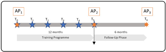 Figure 6 shows the timeline of the study, the duration of the training programme, the training modules, and the assessment points. The six training modules take place around every 8–10 weeks (at T0–T5), totalling in a one-year duration for the whole training programme. The study protocol follows the SPIRIT 2013 guidelines (see File S1).