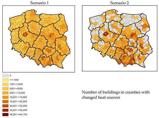 Since the programme uptake is lower than expected, we have addressed partial implementation (50%) and focused only on the replacement of old solid fuel heat sources. This allowed for precise calculations of the primary emission changes. At the same time, in the case of building insulations, estimating heat demand and assumptions in the heating installation would introduce high uncertainty of the emission scenario. In the proposed scenarios, it was assumed that half of the buildings, or approximately 2 million detached houses, would have the heat source replaced. In detached houses (BDOT code 1110—Database of Topographical Objects—single-family buildings) [38], the emission factors were changed to correspond to the fuel standards of modern heating installations. The number of buildings in the counties with changed heat sources is shown in Figure 2. Buildings were randomly selected in areas of a county meeting certain conditions based on modelling results for the 2019 assessment: