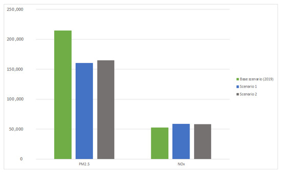Total emissions of PM2.5 and NO2 in base scenario, scenario 1, and scenario 2.