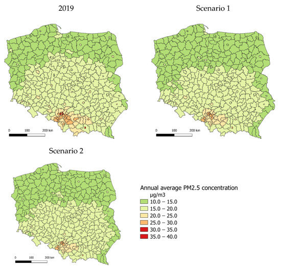 Figure 4 shows the annual average concentrations of PM2.5 in 2019 for scenarios 1 and 2. In 2019, the annual average concentrations of PM2.5 in counties ranged from 12 to 34 µg/m3. Exceedances of the permissible concentration level (20 µg/m3) occurred in major cities throughout the country, particularly in southern Poland. The results for scenario 1 show that more counties in the central and eastern parts of the country would be characterised by the annual average PM2.5 concentrations in the lower range—from 10 to 15 µg/m3. Concentrations throughout the country would range from 12 to 29.5 µg/m3. In scenario 2, the distribution of annual average concentrations has a similar pattern.