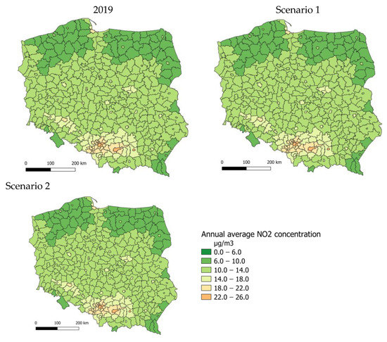 Figure 5 shows the spatial distribution of annual average NO2 concentrations in 2019 for scenarios 1 and 2. In 2019, annual average nitrogen dioxide concentrations calculated for the counties ranged from 8 to 24 µg/m3. Higher concentrations occurred in the central and southern parts of Poland. The assumed change in emissions in scenarios 1 and 2 would result in a slight increase in NO2 concentrations across the country. The spatial distribution is similar for the base and two analysed scenarios.