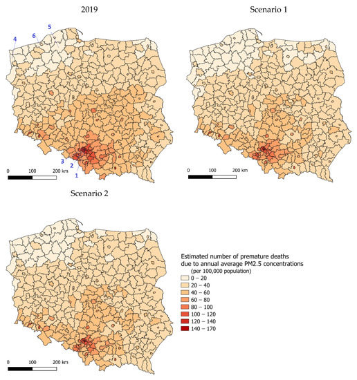 Estimated number of premature deaths due to annual average PM2.5 concentrations in 2019, as projected for scenario 1 and scenario 2; per 100,000 population; counties averages. Numbers 1–6 refer to the counties presented in detail in Table 2.