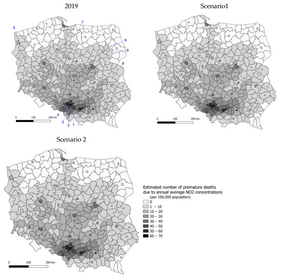 Figure 7 shows the estimated number of premature deaths due to the annual average NO2 concentrations in 2019, scenarios 1 and 2. In 2019, the estimated number of premature deaths due to NO2 ranged from 0 to 70 cases per 100,000 inhabitants. Lower exposure occurred in the northern and eastern parts of Poland. In comparison, higher exposure occurred in the central and southern voivodeships (Silesia and Małopolska). Emission changes in scenarios 1 and 2 would result in a slight increase in NO2-concentration-related mortality. The spatial distribution would be very similar to the pattern calculated for 2019. Table 3 shows three counties with the highest exposure, three with the lowest exposure for the base, and two emission scenarios. In all counties where the annual average NO2 concentration was below 10 µg/m3, the health impacts from exposure are equal to 0 due to the assumed reference level.