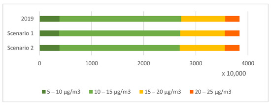 Figure 8 and Figure 9 show the total number of people exposed to annual average concentrations of PM2.5 and NO2 in 2019 and the changes due to emission reduction assumed in scenarios 1 and 2. For PM2.5, annual concentration below 10 µg/m3 averaged for the counties did not occur in 2019. Most of the population lived in areas where the annual average PM2.5 concentration ranged from 15 to 20 µg/m3. However, about 25% of the population in 2019 lived in places where annual average concentrations exceeded the 20 µg/m3 threshold. The change in emissions assumed in scenario 1 would reduce the population exposed to the annual average concentrations exceeding the permissible level to 17%. In scenario 2, with the measures applied in areas with the highest exposure, the population exposed would be about 14%.