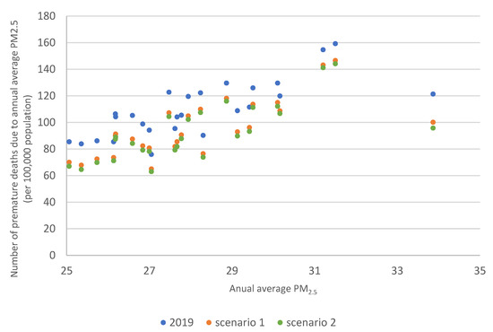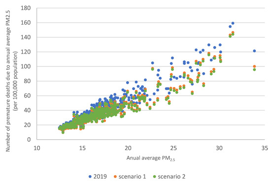 Scatterplots 10 and 11 show the relationship between the annual average PM2.5 concentration and the number of premature deaths in the baseline scenario 2019 and scenarios 1 and 2. Figure 10 is for all counties in Poland, and Figure 11 is for counties where the annual average PM2.5 concentration was higher than 25 µg/m3. Figure 10 shows that the relationship is close to linear. The correlation factor for 2019 was: 0.96 for scenario 1:0.95 and scenario 2:0.94. In Figure 11, the average reduction in premature deaths between 2019 and scenario 1 was 14 cases (highest reduction—21cases, lowest reduction—11 cases), and between 2019 and scenario 2, an average of 17 cases (highest reduction—26 cases, lowest reduction—13 cases). Emission changes in scenario 2 would result in higher reductions in premature deaths in counties where annual average PM2.5 concentrations are higher than 25 µg/m3.