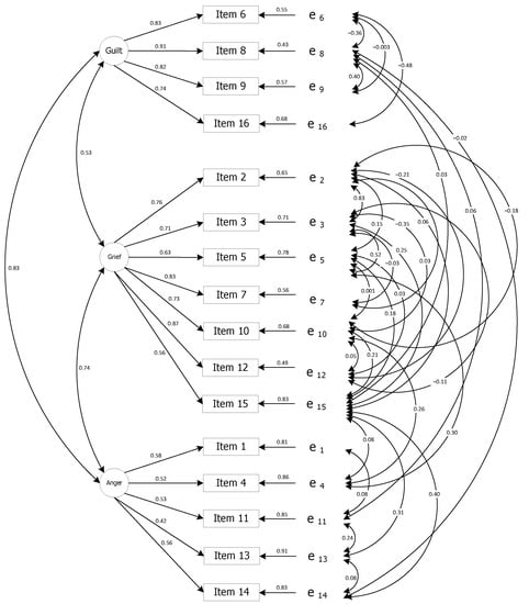 The results of the CFA revealed that the 16-item, 3-factor model of the Portuguese version of the PBQ (latent variables: Guilt, Grief and Anger) provided a good fit model for the data (see Figure 1). All items significantly loaded their hypothesized factors and good fit indices, = 109.8; = 70; p < 0.001; NFI = 0.92; CFI = 0.97; RMSEA = 0.059; 90%CI = [0.036, 0.079]. Standardized factor loadings greater than 0.3 were also observed for all items.