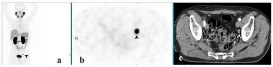 A PSMA-avid lesion in a blastic lesion in the iliac bone. 68Ga-PSMA scan, maximum intensity projection (MIP) (a) and corresponding PET (b) and CT (c) axial slices demonstrating focally increased uptake in the blastic lesion in the iliac bone on the left (arrows).