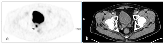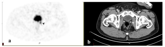 A PSMA-avid lesion in the seminal vesicles. 68Ga-PSMA scan, PET (a) and CT (b) axial slices demonstrating focally increased uptake in the seminal vesicles on the right (arrows).