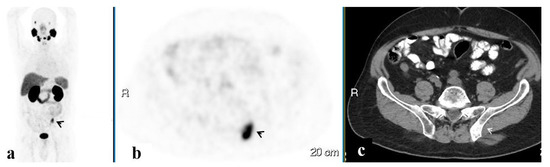 A PSMA-avid lesion in a solitary pelvic lymph node. 68Ga-PSMA scan, maximum intensity projection (MIP) (a) corresponding PET (b) and CT (c) axial slices demonstrating focally increased uptake in the solitary pelvic lymph node on the left (arrows).