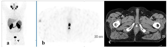 68Ga-PSMA scan, maximum intensity projection MIP (a) and corresponding PET (b) and CT (c) axial slices demonstrating focally increased uptake at the base of the penis (arrows).