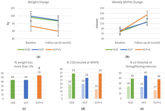 Changes in weight, physical activity, and dietary intake among intervention groups between baseline and follow-up (6-month). (a) Mean weight change; (b) mean weekly moderate-to-vigorous physical activity (MVPA) change; (c) percentage who lost more than 3% of their weight; (d) percentage who performed 150 min/week of MVPA; (e) percentage who performed two or more sessions per week of strengthening exercise; (f) percentage who consumed red meat two or fewer times in the past week; (g) percentage who consumed one or more cups of fruit per day; (h) percentage who consumed three or more cups of vegetables per day; (i) percentage who consumed fast food two or fewer times in the past week; (j) percentage who ate breakfast every day in the past week; (k) percentage who drank no sweetened beverages in the past week; VLB = Vibrant Lives Basic; VLP = Vibrant Lives Plus; VLP + S = Vibrant Lives Plus with Support; (a,b) repeated-measure mixed models; (c) logistic regression; (d–k) repeated measure logistic regressions; except for breakfast consumption, all had significant time differences (p < 0.05). † Significant group differences compared to VLB arm (p < 0.05).