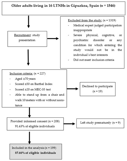 This multicenter, cross-sectional study was conducted at 16 LTNHs in Gipuzkoa (Basque Country, northern Spain). Data were collected in January–June 2018. Participants were enrolled based on the following inclusion criteria: age ≥ 70 years; score of ≥50 on the Barthel Index [27]; score of ≥20 on the Mini-Examen Cognoscitivo-35 (MEC-35) test (an adapted and validated version of the Mini-Mental State Examination in Spanish) [28]; and capable of standing up from a chair and walking independently or with any aid for at least 10 m. Exclusion criteria included: if participation was judged inappropriate by a medical expert due to any risk of heart failure or ischemic events; in cases of severe physical, cognitive, or psychiatric disorders; or in cases of any other condition for which study participation was not in the best interest of the individual. After considering these criteria, 199 older adults were included in the study (Figure 1). All participants gave informed consent, and the Research Ethics Committee of the University of the Basque Country approved the study (Human Committee Code M10/2018/171).