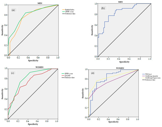 Receiver operating characteristic (ROC) curves to identify frailty by Fried Frailty Phenotype (FFP) in men (a,b) and women (c,d) using different measures: Barthel Index, Timed Up and Go (TUG) test, Short Physical Performance Battery (SPPB) score, Quality of Life in Alzheimer’s Disease (QoLAD), and Goldberg Anxiety and Depression scales. ROC curves of TUG test (for men and women) and Goldberg Anxiety and Depression scales (for women) have been plotted inverted for better comparison.