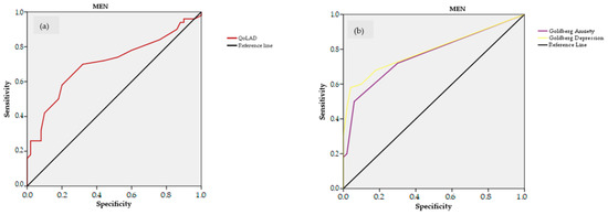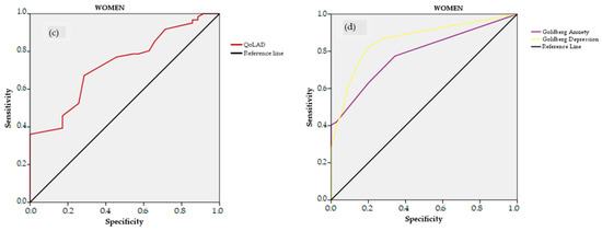 Receiver operating characteristic (ROC) curves to identify frailty by Tilburg Frailty Index (TFI) in men (a,b) and women (c,d) using different measures: Quality of Life in Alzheimer’s Disease (QoLAD), and Goldberg Anxiety and Depression scales. ROC curves of Goldberg Anxiety and Depression scales have been plotted inverted for better comparison.