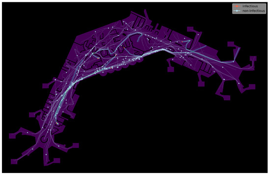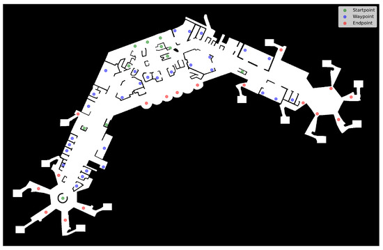 The simulation runs on a defined set of agents of given size at the same time, and over a defined period of time , measured in seconds, with by default. Initially, each agent is assigned a destination point , which is chosen uniformly random from the set D of available points. However, to avoid crowding around starting points at the beginning of the simulation, which would also lead to distorted data concerning aerosol exposure levels (cf. Section 3.4.1), the initial starting positions of the agents are spread randomly across the (walkable) area of the terrain, instead of drawing from the available starting points S. These points are used only afterward, as described below. A possible starting point configuration is shown in Figure 4.