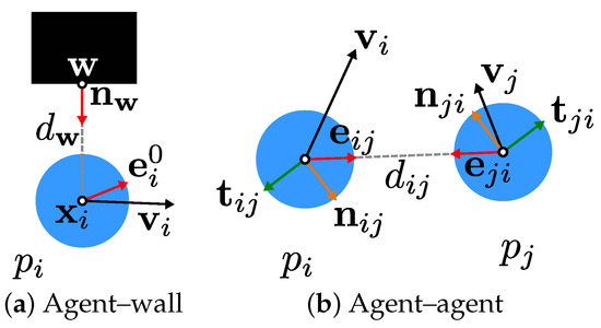 Interactions according to the underlying model of pedestrian dynamics between (a) agents (shown as blue points) and obstacles (black rectangle) and (b) between two agents, with associated quantities.