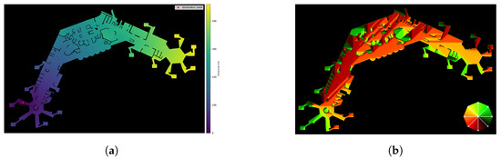 Path-finding is done by applying Dijkstra’s Algorithm [46] to the floor plan, generally assuming an 8-neighbourhood-connectivity at each point of the floor-plan . Depending on the problem, other algorithms can also be integrated for the pathfinding, like, for example, A* [47] or fast-marching based methods [48,49]. This results in scalar fields , one for each way- and destination point . Each of those maps consequently holds the minimum distance to the destination point for each walkable position . Following, the gradient operator is applied to the distance field giving a vector field , . Exemplary colour-coded visualisations of the resulting scalar- and vector fields are shown in Figure 3a and Figure 3b, respectively. The colours in Figure 3a indicate the distance to the destination point, from near (violet) to far (yellow). In Figure 3b, the colours correspond to directions of the shortest path at every position, as shown in the colour-wheel at the lower right. For example, pure orange colour implies movement to the left, and pure green colour implies the upper right direction. Blended colours accordingly stand for directions in between.