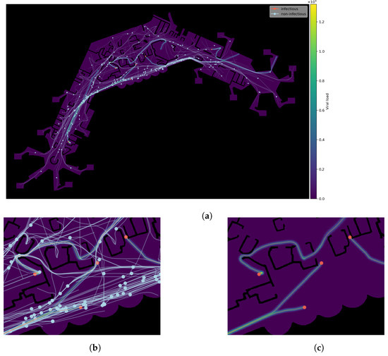Detail view of trajectories and aerosol trail generation. (a) Exemplary agent trajectories and aerosol trail generation. (b) Detail view with agents, trajectories, and aerosol traces. (c) Detail view showing only infectious agents and traces.
