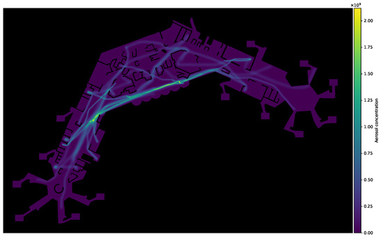 Tidal air virus concentration is measured in [50], the actual value is sampled from a normal distribution at each step. The actual virus concentration deposited is calculated as the product of respiration rate , viral load , and length of the time-step . Figure 6 shows an exemplary visualisation of aerosol concentration level within the simulation area.