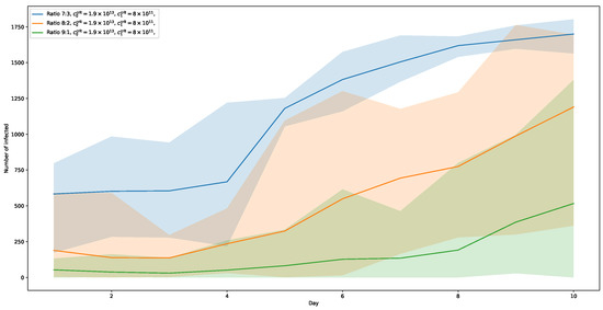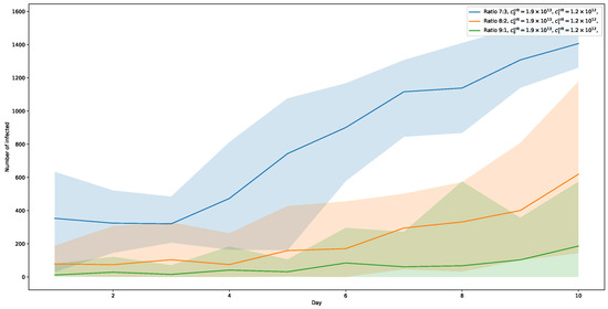 The strength of our social-force-based simulation lies in tracking contact times with great geometric detail, mostly in a confined space, but, more importantly, in a rather short period of time. To overcome this limitation, we propose the following additions, to simulate coherence over time between multiple runs of the simulation. This way, not only the effects of an agent passing the infection on to other agents can be taken into consideration, but possible re-infection as well. Central to our method is a subset of agents which persists over the multiple runs of the simulation. To this end, a subset is chosen from the set of all agents available in the pool of the first simulation run. In the context of the airport terminal scenario chosen here, persistent agents would most likely correspond to personnel working at the airport. Then, a series of a total of discrete simulations are run, each simulation representing a consecutive day in the simulated (airport terminal) setting. Each simulation is run with the same basic settings. The agent pool for each simulation following the first one are sampled randomly from the same distributions except for the set of persistent agents. From simulation-day, m to , the set of agents are transferred to with their state being the one of the ends of the simulation of day m. In the transition from day m to day , it is checked whether a persistent agents’ aerosol viral exposure level is above a given threshold for the corresponding virus type. If this is the case, the agent is assumed to be infected by the end of a certain incubation period of days, which is sampled from (cf. [51,52,53]). If this incubation period is over, the agents infection status is set to 1 (along with the according virus-type ). This way, the detailed spatial simulation of virus spreading is extended into the time domain.