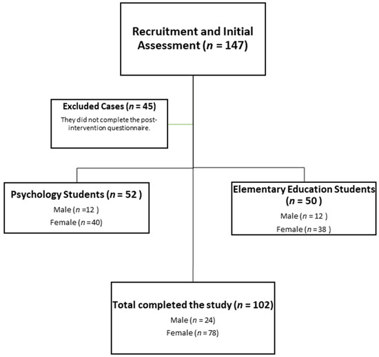 The initial sample consisted of 147 students belonging to the University of Extremadura, where an educational innovation program was implemented through gamification and cooperative work in peer, mixed, and interdisciplinary teams. In the first and last sessions, students volunteered to answer an online survey. This survey was completed by 102 students (69.3% of the participants), 78 females, and 24 males aged 18–29 (18.70 ± 1.70). There was a lower number of men due to the demographic characteristics of the entry profile to the Psychology and Primary Education degrees. In our final intake, 50 students were studying for a bachelor’s degree in Primary Education, and 52 students were studying for a bachelor’s degree in Psychology (Figure 2).