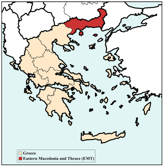EMT is one of the thirteen first-level administrative entities of Greece, extending at an area of over 14,157 km² in the northeastern part of the country and bordering Turkey to the East, Bulgaria to the North, and the Aegean Sea to the South (Figure 1). ΕΜΤ combines the coastal region on the south with mountainous areas on the north and extensive flatlands, mainly in the central and southern parts of the region. The highest peaks are Mount Falakro (2232 m) and Orvilos (2212 m), both located in the regional unit of Drama. Moreover, two rivers cross the region, namely river Nestos at the central part of the region and river Evros which is a natural border for Greece, Bulgaria, and Turkey.