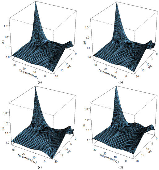 - Gasparrini, A.; Armstrong, B.; Kenward, M.G. Distributed lag non-linear models. Stat. Med. 2010, 29, 2224–2234. [Google Scholar] [CrossRef]