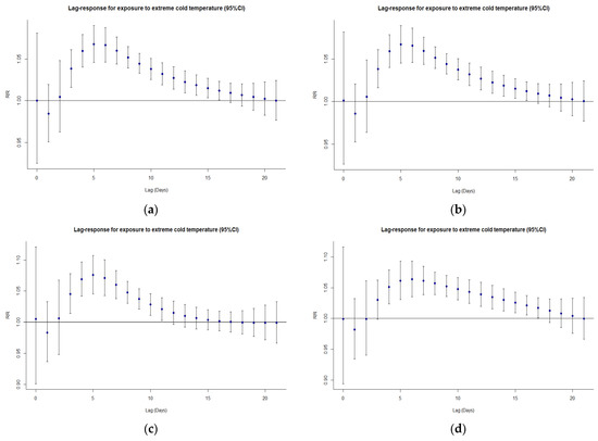 Lag-response curves for exposure to extreme cold (95% CI) for (a) the total population, (b) the elderly, (c) males, and (d) females.