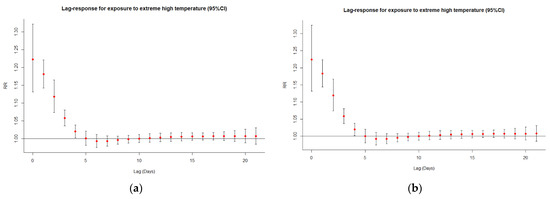 As shown in Table 2, when considering the whole period of 21 days, the highest overall relative risks of mortality were estimated for exposure to extreme temperatures. Regarding the two genders, exposure to extreme heat was more dangerous for males (lag 0–21: 1.88, CI: 1.44–2.44), whereas females were found to be more sensitive to extreme cold, with a relative risk of cardiorespiratory mortality equal to 1.88 (CI: 1.44–2.45) on lag 0–21 (Table 2). These gender differences were statistically significant according to the Chi-square test. Moreover, the elderly were found to be particularly vulnerable to temperature-related mortality, with the highest values of overall relative risk estimated under extreme heat (lag 0–21: 1.94, CI: 1.60–2.36) (Table 2). Regarding moderate temperatures, moderately hot conditions were more dangerous for cardiorespiratory mortality in EMT compared to moderate cold. A thorough examination of Table 2 reveals that the cumulative relative risks of high temperatures were maximized at lags 0 and lags 1–2, as opposed to the relative risks of low temperatures that were apparent from lag 3 and onwards.