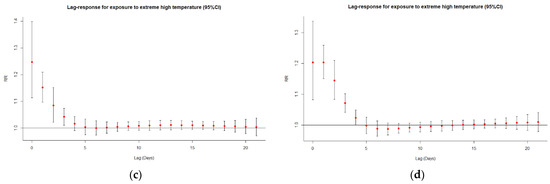 Lag-response curves for exposure to extreme heat (95% CI) for (a) the total population, (b) the elderly, (c) males, and (d) females.