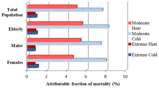 The fraction of mortality attributed to moderate and extreme temperatures for the total population and its subgroups in EMT.