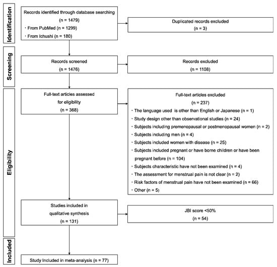 After screening the titles and abstracts of 1476 studies, 1108 that did not meet the inclusion criteria were excluded. After screening the full text of 368 studies, 237 were excluded. The risk of bias of the remaining 131 studies was evaluated using the JBI score (Supplementary Table S1); among these, 31 (JBI score ≥ 70%) [5,9,10,11,12,13,14,15,16,17,18,19,20,21,22,23,24,25,26,27,28,29,30,31,32,33,34,35,36,37,38], 46 (JBI score ≥ 50% and <70%) [6,39,40,41,42,43,44,45,46,47,48,49,50,51,52,53,54,55,56,57,58,59,60,61,62,63,64,65,66,67,68,69,70,71,72,73,74,75,76,77,78,79,80,81,82,83], and 54 (JBI score < 50%) [84,85,86,87,88,89,90,91,92,93,94,95,96,97,98,99,100,101,102,103,104,105,106,107,108,109,110,111,112,113,114,115,116,117,118,119,120,121,122,123,124,125,126,127,128,129,130,131,132,133,134,135,136,137] were of high, middle, and low quality, respectively. Hence, 54 studies were excluded. Finally, 77 studies were included in the meta-analysis.