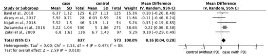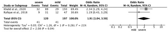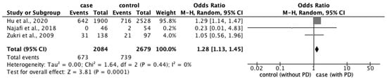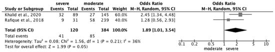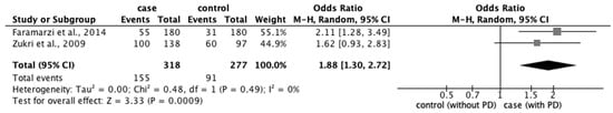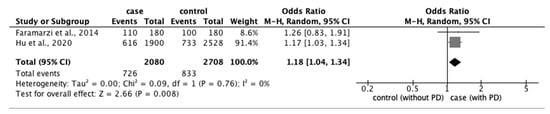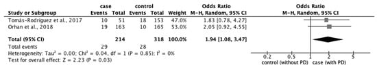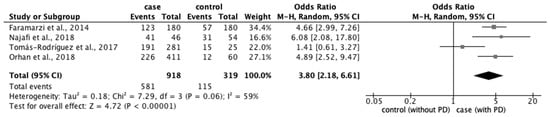 Statistical analysis and meta-analysis were performed using Review Manager software version 5.4 (The Nordic Cochrane Centre, Copenhagen, Denmark). We used the random-effects models to calculate each outcome’s risk regarding prevalence and severity (mild, moderate, or severe) for PD and PMS. The effect size was reported as odds ratio (OR) and its 95% confidence interval (CI).