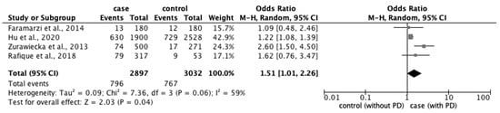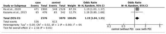 From the 77 studies, we extracted data regarding (1) physical characteristics, such as age, body mass index (BMI), and race; (2) menstrual characteristics, such as age at menarche, number of menstrual days, menstrual cycle, and family history of PD; and (3) lifestyle factors, such as stress, smoking habit, alcohol intake, caffeine intake, skipping breakfast, physical activity, sleep duration, and bedtime. The meta-analysis revealed that eight factors were significantly associated with the prevalence of PD: age ≥ 20 years (OR: 1.18; 95% CI: 1.04–1.34) (Figure 2); BMI < 18.5 kg/m2 (OR: 1.51; 95% CI: 1.01–2.26) (Figure 3); longer menstrual periods (OR: 0.16; 95% CI: 0.04–0.28) (Figure 4); irregular menstrual cycle (OR: 1.28; 95% CI: 1.13–1.45) (Figure 5); family history of PD (OR: 3.80; 95% CI: 2.18–6.61) (Figure 6); stress (OR: 1.88; 95% CI: 1.30–2.72) (Figure 7); sleeping for <7 h (OR: 1.19; 95% CI: 1.04–1.35) (Figure 8); and bedtime after 23:01 (OR: 1.30; 95% CI: 1.16–1.45) (Figure 9). A significant OR was found for two factors associated with the severity of PD (severe vs. moderate): BMI < 18.5 kg/m2 (OR: 1.89; CI: 1.01−3.54) (Figure 10) and smoking habit (OR: 1.94; 95% CI: 1.08–3.47) (Figure 11). The severity of PD (severe vs. mild) was significantly associated with BMI < 18.5 kg/m2 (OR: 1.91; 95% CI: 1.04–3.50) (Figure 12).