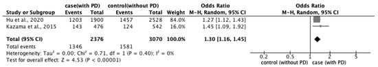 Forest plot showing meta-analysis of studies comparing the number of women with and without PD who go to bed at 23:01 or later [6,20]. The analysis was performed using a random-effects model. PD, primary dysmenorrhea. The black diamond and its extremities indicate the pooled risk ratio center and a 95% confidential interval.