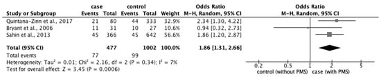 From the 77 studies, we extracted data regarding (1) physical characteristics, such as age, body mass index (BMI), and race; (2) menstrual characteristics, such as age at menarche, number of menstrual days, menstrual cycle, and family history of PD; and (3) lifestyle factors, such as stress, smoking habit, alcohol intake, caffeine intake, skipping breakfast, physical activity, sleep duration, and bedtime. The meta-analysis revealed that the prevalence of PMS was significantly associated with smoking (OR: 1.86; 95% CI: 1.31–2.66) (Figure 13).