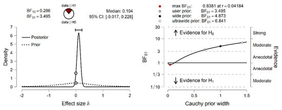 No significant differences in Efficacy were observed between the low/high anxiety sensitivity groups. To test the evidence in favor of H0 against H1, the BF01 was computed (Bayes factor in favor of H0 over H1). The Cauchy prior width was set at its JASP predetermined value of r = 0.707. As observed on the left of Figure 1, it is obvious that most of the posterior distribution is positive. The posterior median was 0.104, which varied from −0.017 to 0.228, and 95% CI. The BF01 was 3.49, which indicates that the data observed were 3.49 times more likely under H0 than under H1.