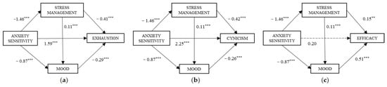 Statistical diagrams of the direct effects on the mediation models proposed. [Note. (a) Anxiety sensitivity and Exhaustion; (b) Anxiety sensitivity and Cynicism; (c) Anxiety sensitivity and Efficacy. ** p < 0.01, *** p < 0.001].
