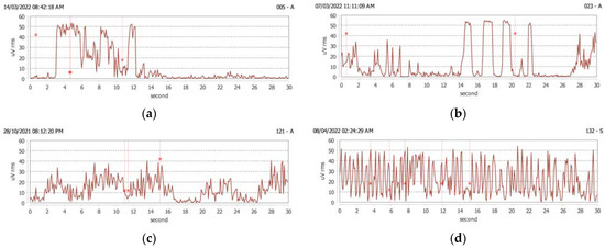 Based on all the recordings, the device made a summary of the relevant activities recorded at the masseter level, which were reported as a percentage of the maximum contraction (Figure 2a–j).