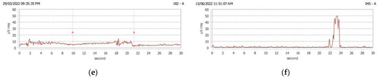 sEMG events (expressed by root–mean–square voltage at a specific moment of time): (a) tonic contraction, (b) rhythmic or phasic contraction, (c) light grinding or rubbing of the teeth, (d) severe grinding, (e) mandibular clenching, and (f) pushing the mandible.