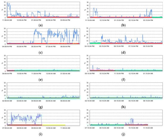 Comparative analysis of the summary of relevant activities recorded at the masseter level (sleep time interval—green color, awake time interval—red color, detachment time interval—yellow color) for: (a,c,e,g,i) one participant from the study group and (b,d,f,h,j) one participant from the control group.