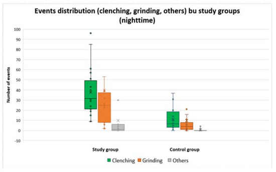The limits of the present study are given by the number of participants and the duration of recordings. It should also be emphasized that the present research provided the frequency, duration interval, and the intensity of masticatory muscle activity in two groups of participants: a group with “possible bruxism” and a group that reported no signs of bruxism. The data recorded on the EMG dia-BRUXO device represent separated entities from those recorded by other devices and PSG recordings.