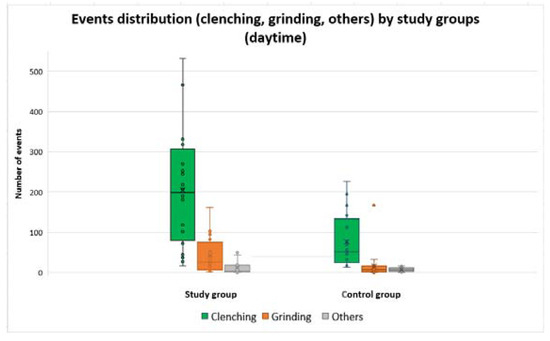 Distribution of clenching, grinding, and other types of events, for the two groups, during daytime.
