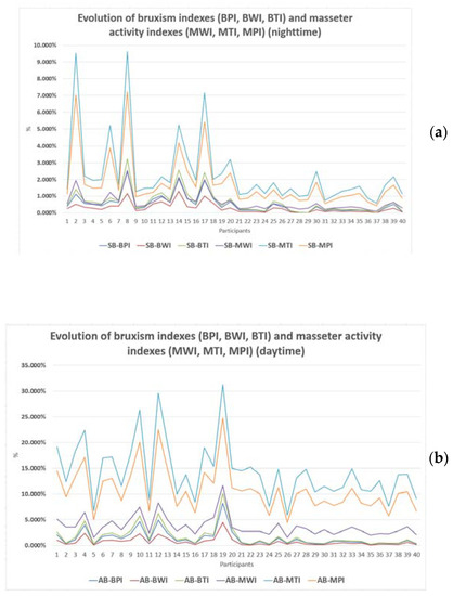 Therefore, the results obtained following our study cannot be compared with those of other studies, because these recordings must be reported at a threshold of activity considered normal. This threshold may be considered as a proportion of the maximum level of voluntary contraction, as a multiple of the baseline level of muscle relaxation, or as the level of muscle activity reached during swallowing. Extensive variability has been found in the literature for the thresholds used to characterize SB events [44,45,46,47,48,49,50,51]. According to the manufacturer of the dia-BRUXO device, in this study, the events recorded for this device are reported relative to the maximum contraction.