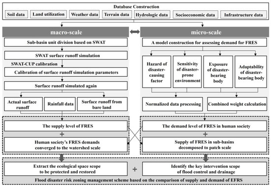 Based on the concept of service spatial flow, cross-scale comparisons are possible. That is, in the watershed space, the FRES demands of the microscopic land patches are pooled into the sub-basin unit, and the FRES supply of the macroscopic sub-basin unit is decomposed into the land patches, to realize the cross-scale comparison of supply and demand. Therefore, the technical route of this research is shown in Figure 2. Firstly, the catchment unit of the molecular watershed was delimited, the surface runoff was simulated based on the SWAT model [9,22], and the supply of FRES was calculated by taking the sub-basin as the unit. Secondly, based on the risk assessment principle of “disaster-causing factor, disaster-prone environment, disaster-bearing body” [15,39], a FRES demand assessment model for human society was constructed, and the demand for FRES was calculated by taking land patches as units. Thirdly, the supply and demand of FRES were compared across spatial scales. By pooling the FRES demand of each land patch into the sub-basin, the ecological space of the sub-basin with high regulation demand was mainly protected and restored. Through the decomposition of the FRES supply of sub-basin ecosystems to land patches, the construction land patches that urgently require manual intervention to reduce the risk of stormwater can be identified. Finally, a flood disaster risk-zoning management scheme is proposed based on the comparison of FRES supply and demand.