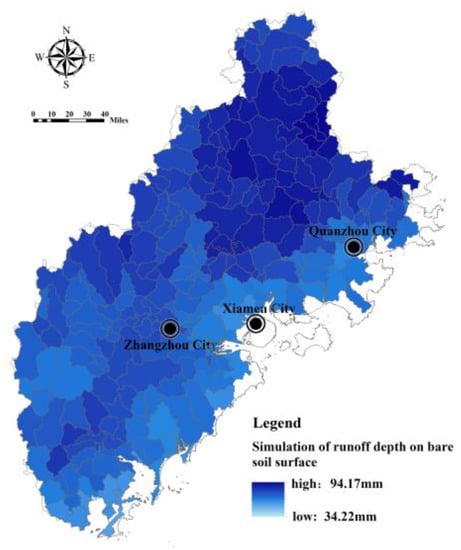 Based on the SWAT model, the Fujian Delta region is divided into 264 sub-basins, covering an area of 24,087 km2 (Figure 4). The bare land surface runoff depth and actual surface runoff depth are simulated by taking the sub-basin as a unit, and the results are shown in Figure 5 and Figure 6. The surface runoff depth of different sub-basin units in the Fujian Delta region varies greatly (the actual runoff depth varies by, at most, 2.74 times). The sub-basin units with a greater surface runoff depth are concentrated in the northern and western mountains. Meanwhile, the surface runoff depth of bare land in each sub-basin is generally greater than the actual surface runoff depth, indicating that the ecosystem plays a significant role in regulating regional hydrology.