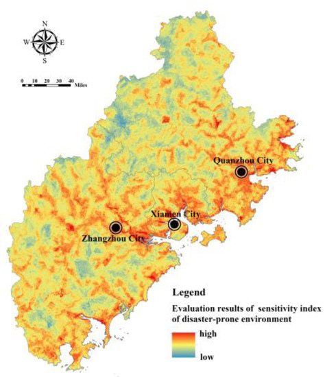 Assessment of the index of sensitivity of disaster-prone environments in Fujian Delta.