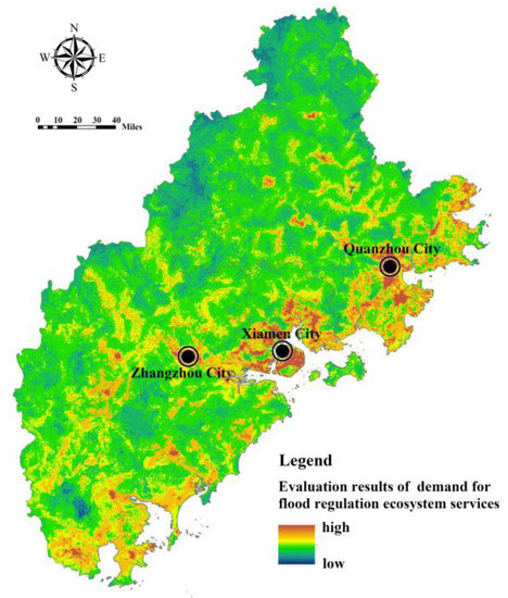 Model (6) was used to calculate the demand index for FRES in the Fujian Delta (Figure 12). It can be seen that the areas with high demand for FRES are concentrated in high-density urban built-up areas, parts of the river valleys, and coastal zones. River valleys and coastal areas have a high risk of being inundated by rising water levels due to their low-lying terrain and proximity to water areas, and the distribution of urban and rural construction land and cultivated land is relatively concentrated. Therefore, the demand for FRES is high. Despite the dense distribution of drainage, rescue, medical care, and transportation facilities in towns and their surrounding areas and their relatively strong ability to cope with flood disasters, high-density urban areas still have the highest demand for FRES compared with ecological and agricultural spaces. However, within the built-up area, the distribution of disaster reduction and relief facilities has a certain impact on the spatial difference in the demand for FRES, which can provide a basis for the hierarchical layout of flood control projects and relief facilities.