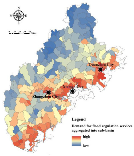 We compared the supply and demand of stormwater regulation services at the macro-scale by taking the sub-basin as the unit and identifying the sub-basin units with an imbalance in supply and demand, to provide a basis for the ecological spatial zoning management plan to cope with rain and flood risk. Model (14) was used to calculate the sum of the FRES demands of all land patches in each sub-basin unit (Figure 13). It can be seen that the sub-basin units with a higher demand for FRES are mainly distributed in the coastal zone and Zhangzhou Jiulong River valley, due to the low-lying terrain, dense population and the distribution of construction land.
