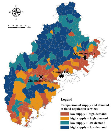 Then, we can compare the FRES supply and demand in sub-basins at the macroscopic watershed scale. Using the quantile method, each sub-basin is divided into high-supply-type and low-supply-type units according to the level of FRES supply, and into high-demand-type and low-demand-type units according to the level of FRES demand. Through spatial superposition processing, four types of regions are identified: “low supply–high demand”, “high supply–high demand”, “low supply–low demand”, and “high supply–low demand” [15]. Then, the ecological space scope that urgently needs to be protected and restored in each sub-basin unit is extracted at the macro-scale and, from the perspective of improving FRES, it provides a scientific basis for the zoning management of ecological space in response to flood damage.